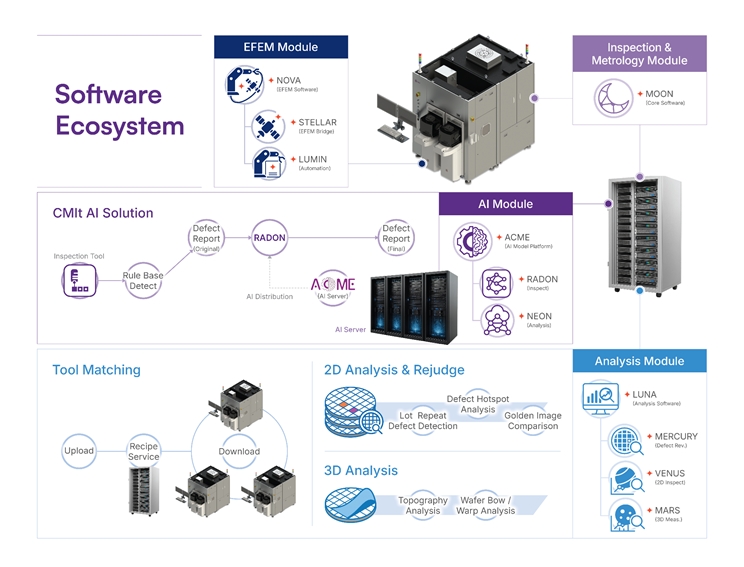 - CMIt軟體生態系統採模組化且高度整合的平台架構,涵蓋檢測引擎、AI分類與進階資料分析等核心模組,具備良好的互通性,提供高度擴充性與彈性,以因應半導體製造需求的持續演進。
